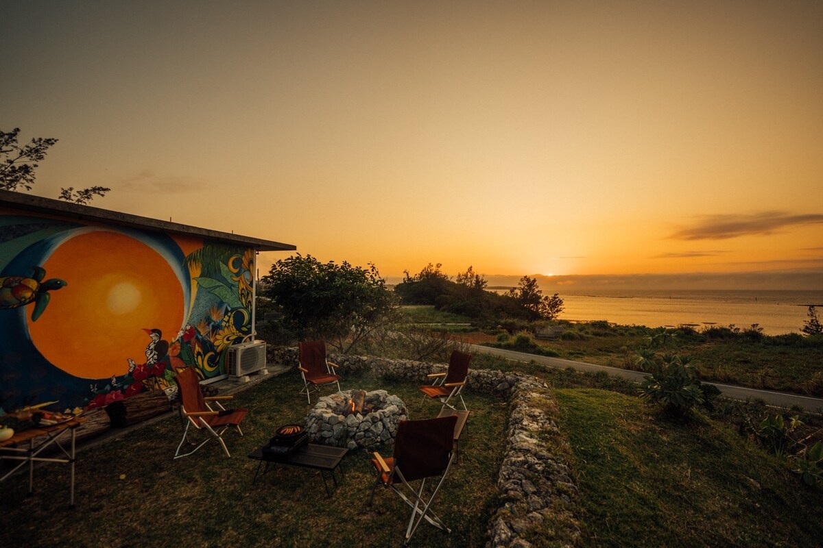 *Private villa JAH-NEI* Set on a quiet hill overlooking Okinawa’s famous Blue Cave and Cape Maeda, this handcrafted retreat offers a private, resort-like stay surrounded by sea, sky, and natural calm. The interior, built entirely with organic materials, brings a grounded sense of luxury. From the patio, the ocean opens like a living painting, while the sunset jacuzzi creates a deep relaxation. Ideal for families and adults seeking refined tranquility. The camper adds a magical hideout for kids.
