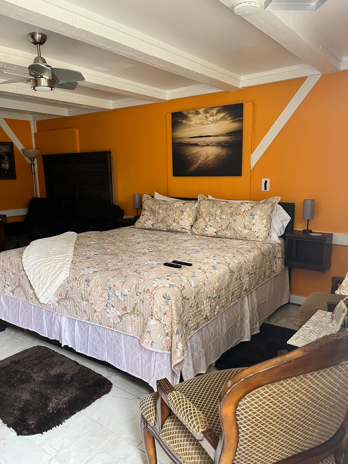 This cozy 1-bedroom, 1-bath studio apartment styled space has the basic comforts of home with a touch of charm. It features a king-sized bed, big screen television, and a programmable electric fireplace. The cozy living area boasts a double recliner loveseat and another television with a kitchenette that includes a mini fridge, microwave, and an air fryer/toaster oven. The rainfall shower head/handheld combo and mirror decorated bathroom help with daily preparation or relaxation.