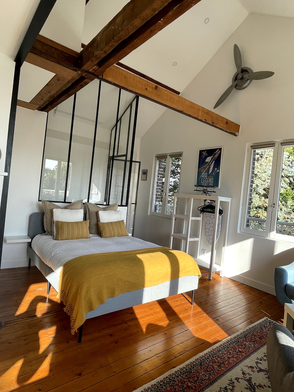 The lodge of the trough was built in an old barn/stable built around 1830. The building, renovated by us, has character, combining rusticity by its trough, its beams of the forest of Retz and its cut stones of Bonneuil-en-Valois, modernity by the combination of glass and industrial steel. The lodging of the trough was designed and arranged to allow everyone to feel like a second « home ». Calm, aesthetics, attention to detail... ideal for a beautiful experience.