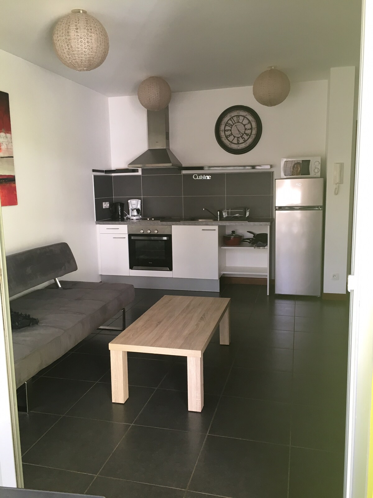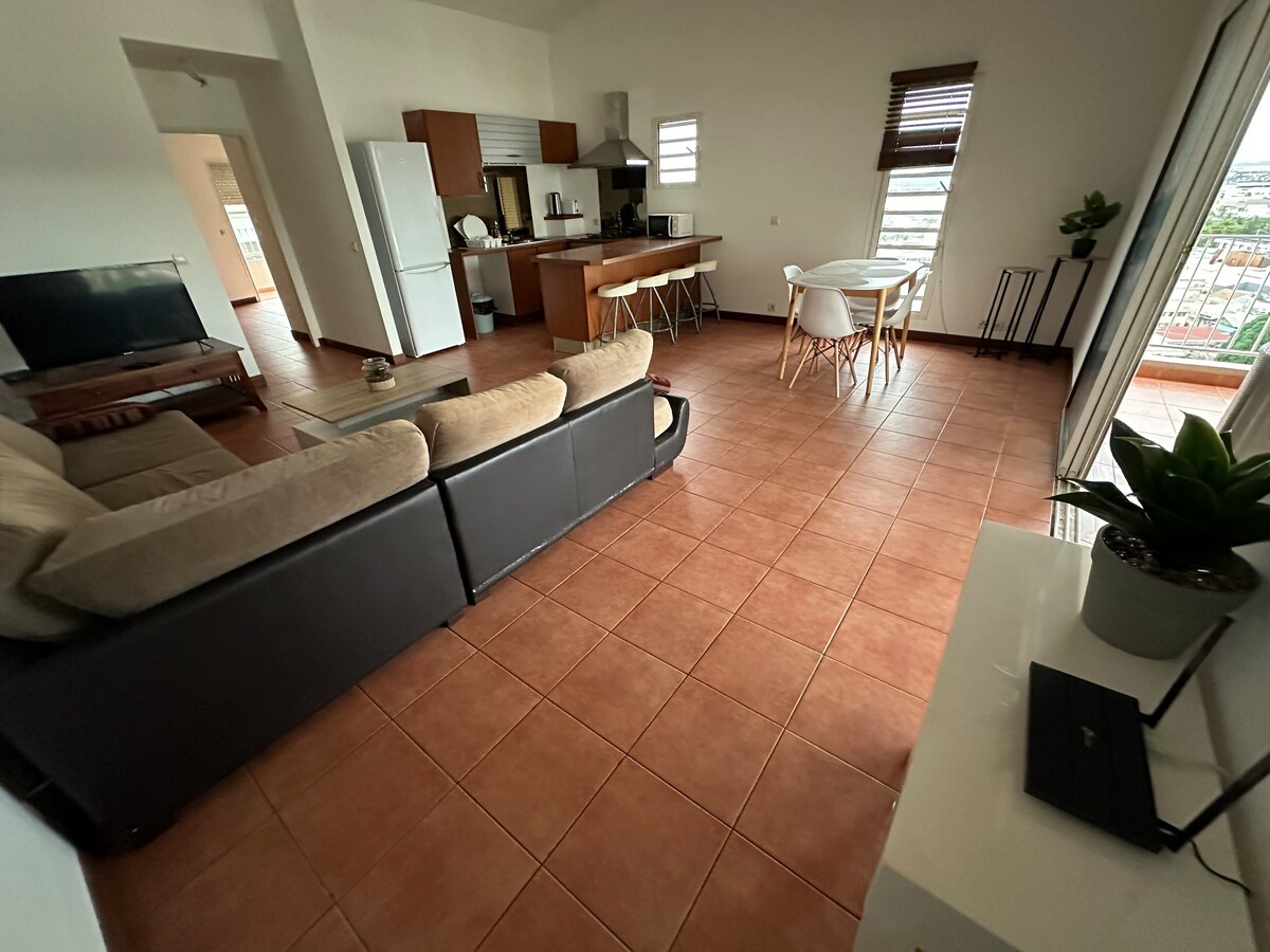 C’est un grand studio de 45m2 sur une colline avec petite vue sur la mer. Le logement est fonctionnel et dispose de tous les éléments nécessaire à votre bien être pendant votre séjour. Il est entièrement équipé: cuisine, salon, espace nuit, salle de bain, wc séparé, balcon, parking, buanderie, ascenseur, cilmatisation. À proximité il y a toutes les commodités nécessaires à votre séjour: marché, commerces, école, centre-ville, restaurants, transport, etc.