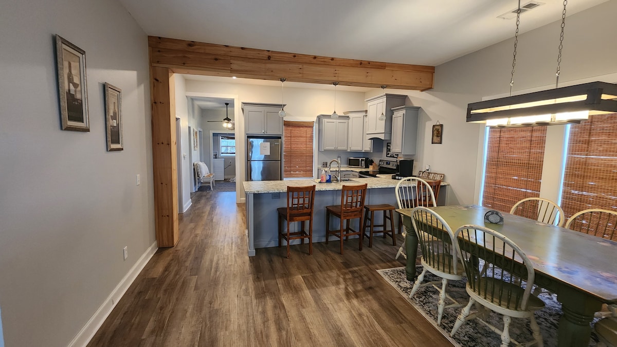 Welcome to the Main Street Loft of Camilla, GA! Experience this historic, 1 bed and 1 bath, full individual apartment loft built in the early 1900s. The Loft has several fast food restaurants nearby and is located approximately 30 mi from Thomasville, Albany, and Moultrie, GA. The wood floors & accent lighting are noted throughout the loft and the bedroom has a king-size bed with a smart TV for viewing. The kitchen has Whirlpool appliances and complimentary coffee & Wi-Fi at your arrival.