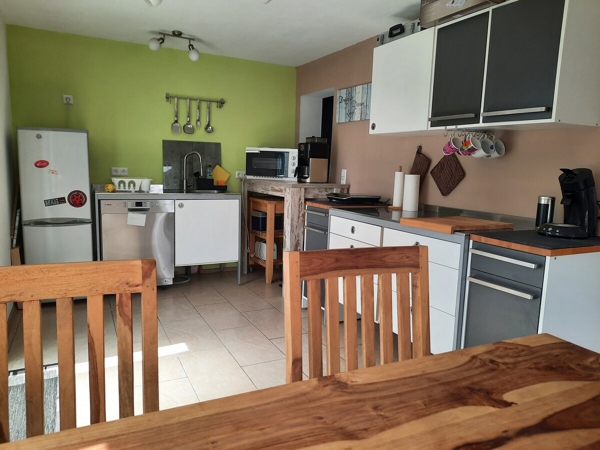 Visit us in our newly renovated vacation home on the over 1000 m² property with directly adjacent stream, covered balcony and large garden area! The 50 square meter wooden house is in a quiet location on the outskirts and was awakened from its Sleeping Beauty slumber with a lot of love for detail. Our small retreat has been completely renovated and newly furnished inside and out. Take a break and recharge your batteries with cozy evenings by the fireplace :-)