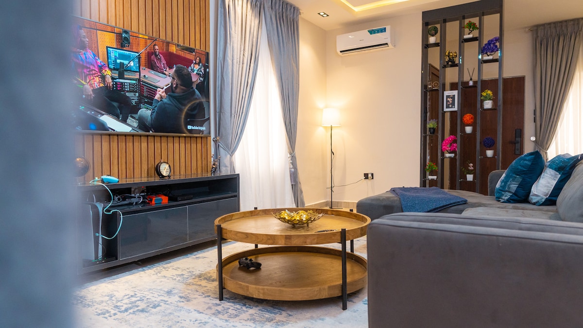 Welcome to our Cozy 1-bedroom in serene Abuja! Experience tranquility with lush indoor plants, entertainment with smart TVs and a PlayStation, and stay connected with high-speed internet. Enjoy uninterrupted comfort with backup power supply and safe neighborhood strolls. Free hassle-free parking and airport pickup/drop-off make your stay extraordinary. Book now for an unforgettable Abuja experience.