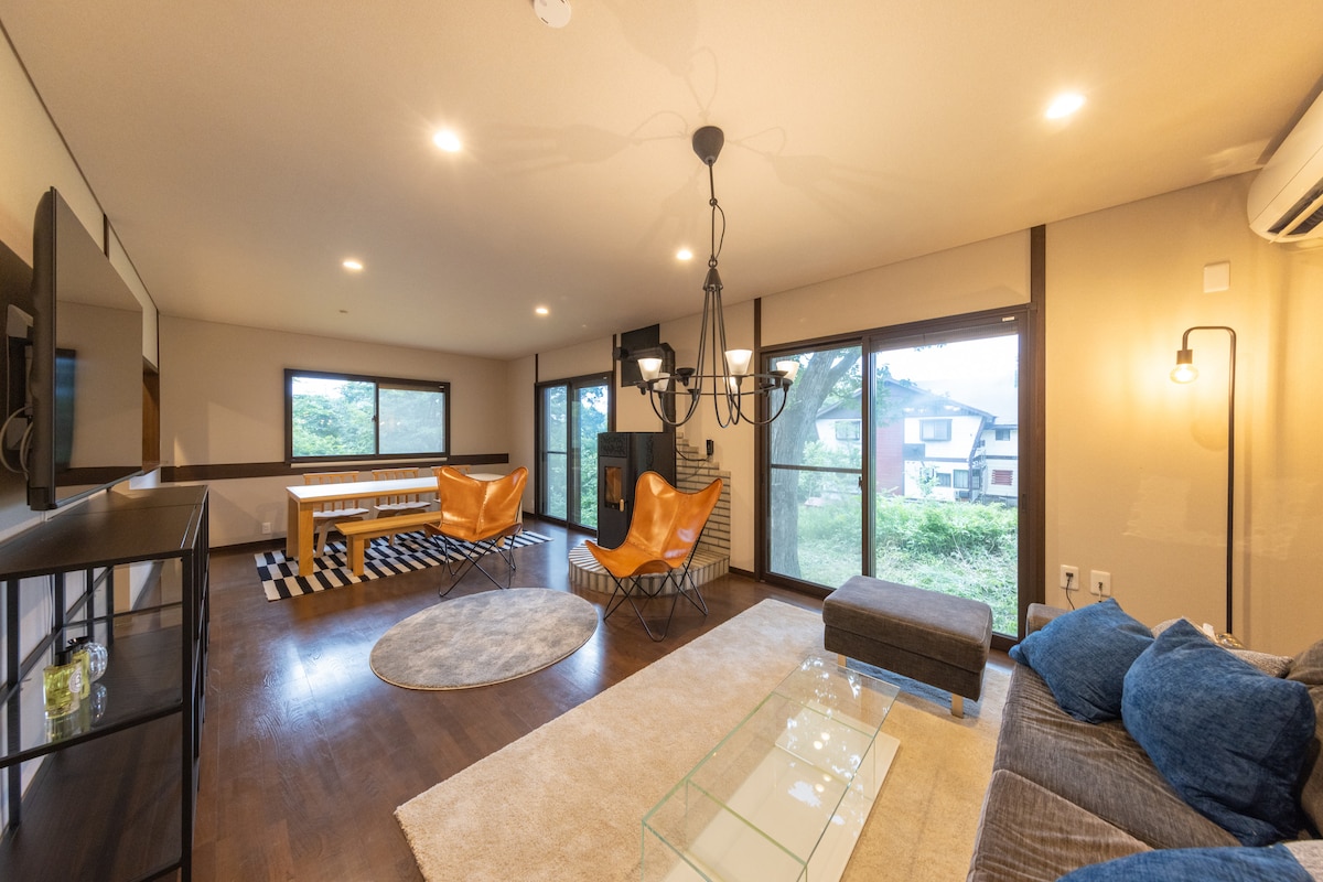 There is also a lot of snow in March, so you can enjoy winter sports such as skiing and snowboarding. It is also a 5-minute drive from Akakura Ski Resort and is a 15-minute walk away.Nagao and Suginohara Ski Resort are also about 10 minutes away by car. This chalet is a house with a fireplace, so you can enjoy a peaceful time. It is located in a quiet environment surrounded by nature. There is a river running through the backyard where you can have a peaceful time listening to the sound of the river.Located at the foot of the national park and close to Lake Nojiri, you will be able to enjoy various activities in the summer.The river in the backyard is so crystal clear that you can enjoy fishing and wading. There is a fireplace in the room renovated by a designer, so you can forget the hustle and bustle of everyday life. It has a kitchen, washing machine, and refrigerator so it is suitable for long-term stays.You can also barbecue in the backyard. Since it is a Japanese house, there is only one bathroom in one building, but everyone has a comfortable stay.