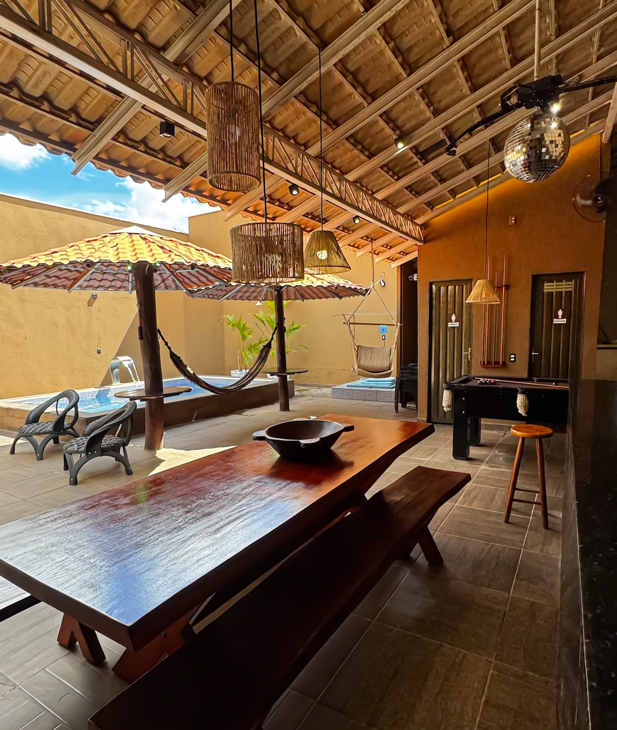 • private ranch with parking • 3 en-suite bedrooms (all exactly the same) • pool with waterfall and whirlpool. • Gourmet area complete with all cooking utensils, also has a fridge, freezer and brewery. • 2 outdoor toilets • pool and jukebox table with karaoke.