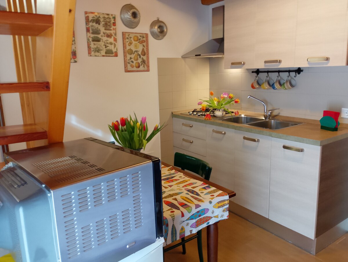 The Primula studio is an excellent solution for single travellers or couples who want to spend time in nature while also having the services of a small town. It has a double bed, a sofa (convertible into a bed on request), a fully equipped kitchen, a bathroom with shower and a living area with fireplace and air conditioning. A pleasant view is visible from the balcony. High-speed Wi-Fi makes it ideal for smart working. Play area in the garden in front of the apartment.