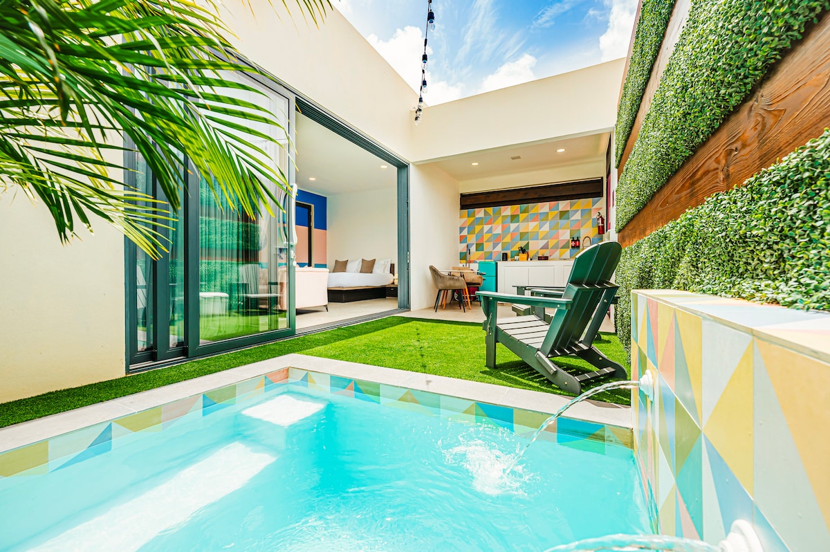 Your own private studio in an adults-only boutique retreat, designed for comfort and seclusion. Each space features a private plunge pool, lush garden, fully equipped kitchen, king-size bed with premium linens, sleek bathroom with hot shower, and a spacious living area with a 65" HD TV. A curated Aruba guide and attentive guest services complete your stay. Welcoming 3 guests per studio.