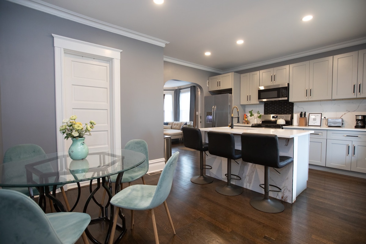 This is a newly remodeled single-family home! It is small but has everything you need to enjoy time with family and friends during your stay in the Chicagoland area! There are two bedrooms each with a queen bed, an updated bathroom, a dining room with seating for 6, a cozy living room with a Crate & Barrel pull-out queen sofa bed, and a nice, updated kitchen! There's a brand-new washing machine and dryer in the basement. There's a nice patio table outside too in the private yard. Welcome!
