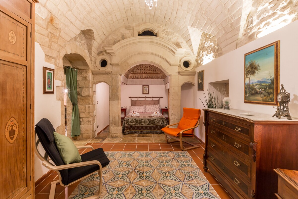 Art Nouveau style furniture, majolica floors from the second half of the 19th century and Florentine terracotta, stone barrel roofs, 18th century alcove with stone portal. In the historic center of Ragusa near the Cathedral of San Giovanni. The house is 50 square meters. Entering the house you will take a dip in the past. When you rest inside the alcove(a place of tender intimacy, unforgettable sensations) you will dream of being between the 17th and 18th centuries in the Sicilian Baroque of Val di Noto Unesco Heritage.