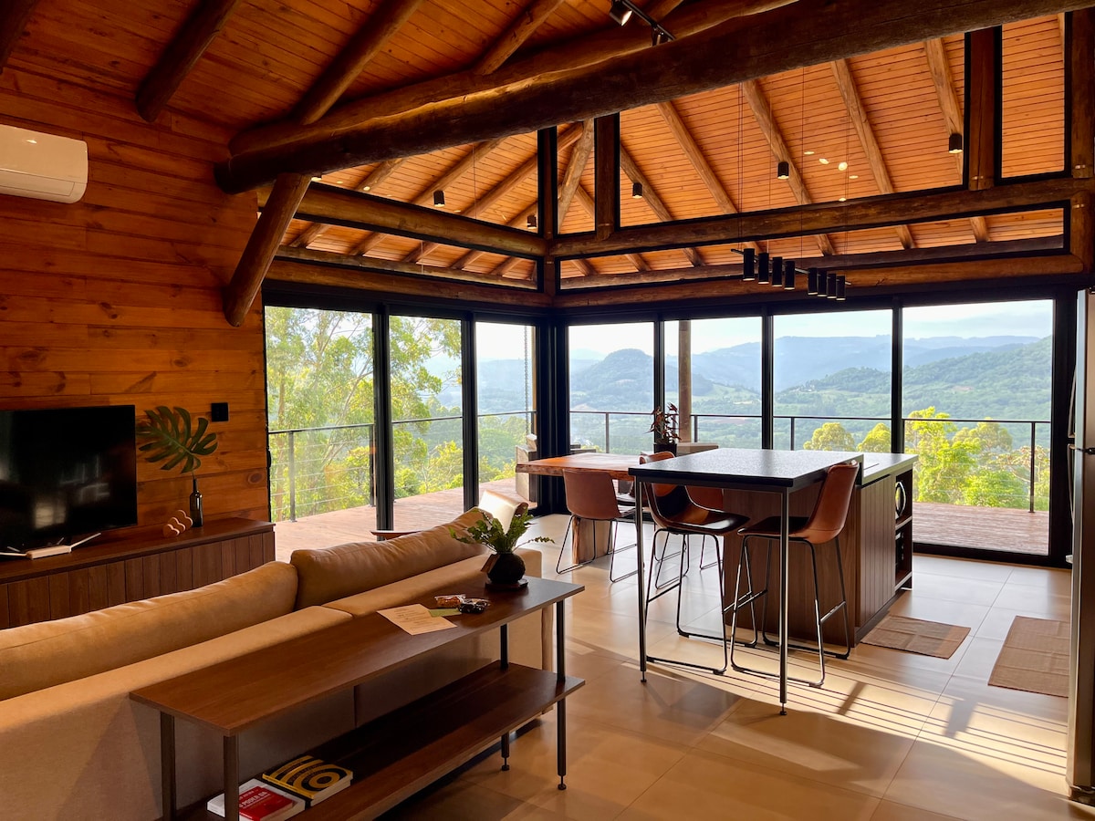 New! Now with a pool! Unique and exclusive project, built at the highest point of the property, where we have the widest and most beautiful view of the region. The house has an en-suite on the upper floor with a hydro bath, panoramic view of the mountains and the sunrise. Integrated living room and kitchen on the first floor with bathroom, sofa bed and covered outdoor deck. Name inspired by the city of Asolo, located in northern Italy, near Monte Grappa, a large and important mountain in the region.