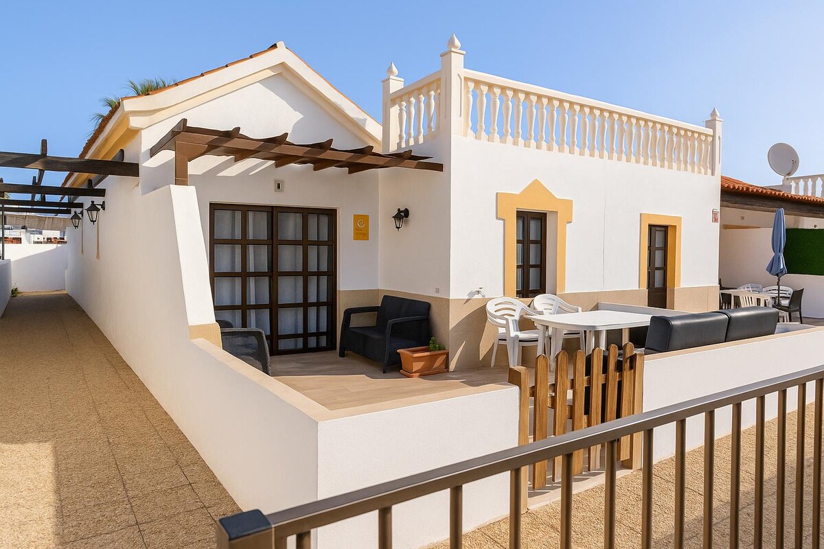Beautiful fully renovated apartment, located in a complex on the Costa de Antigua, in a quiet but well-located area, in the center of the island, to easily tour the island by car. It has a rooftop terrace overlooking the ocean and is fully renovated. With one bedroom, one bathroom and a sofa bed in the living room, as well as a fully equipped kitchen. It has high-speed internet.