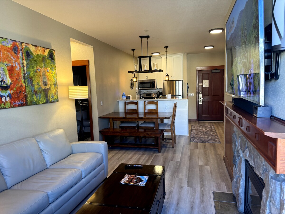 Perfect summer location overlooking event plaza and Ski In, Ski Out convenience in the Winter. Imagine, soaking up the rays on your balcony, with a front row seat for all the entertainment & activities below. Or stay warm in the winter by the cozy indoor fireplace. Charming 1 bedroom condo with everything you need. Furniture and lighting recently updated. Walk downstairs to the restaurants, shops, events and gondola. Condo has 1 King Bed in Bedroom and 1 pull out sofa bed in living room.