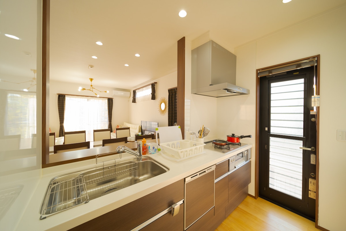Umeno-Yuekigyou is a 4-minute walk from Dazaifu Station, with a convenient convenience store, supermarket within a 1-2 minute walk, and restaurants nearby, ensuring a comfortable stay. This is a luxurious rental of a newly built, modern Japanese-style detached house that can accommodate up to 11 people. Free parking is available for 2 cars, so you can use it as a base for your trip to Kyushu. The main bedroom is equipped with a projector with an electric screen, and we have a contract with U-NEXT, so you can enjoy your favorite movies and dramas on a large screen. You can also enjoy stylish dining and drinks in the balcony area, where chairs and tables are available. The large living dining room is complete with a wooden single board table that can accommodate up to 8 people, and the sofa is a hotel-specified high-quality L-shaped sofa, providing a comfortable sitting experience. We are fully equipped with a washer and dryer, so you will have no trouble doing laundry even if you are staying for consecutive nights or long stays. We have a Nespresso coffee maker to help you relax from your travels. A map of nearby restaurants is available in the guidebook, so please use it as a reference for your meal.