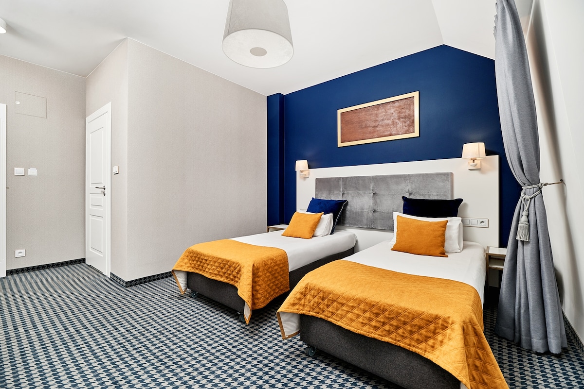Welcome to our hotel, which proudly offers a convenient location close to the railway station and PKS. Once you arrive, you'll easily find our hospitable marina, just a moment from the train and bus stations. The room delights with two single beds in subdued beige and green colors. A functional desk and a mini kitchenette add comfort to create a harmonious place to relax and work.
