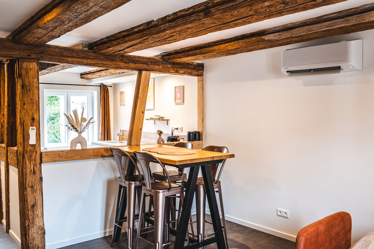 Fully renovated apartment in detached house in Kaysersberg voted most beautiful village in France. Fully equipped kitchen (nespresso machine) Living room with corner leather sofa with meridian , 1 bedroom (bed: width 160). Spacious bathroom with walk-in shower and toilet. Very quiet. Private entrance, Free parking in front of the house. outdoor space with garden furniture and barbecue,fenced. Sheets , towels, toilet paper, soap and shower gel are provided.