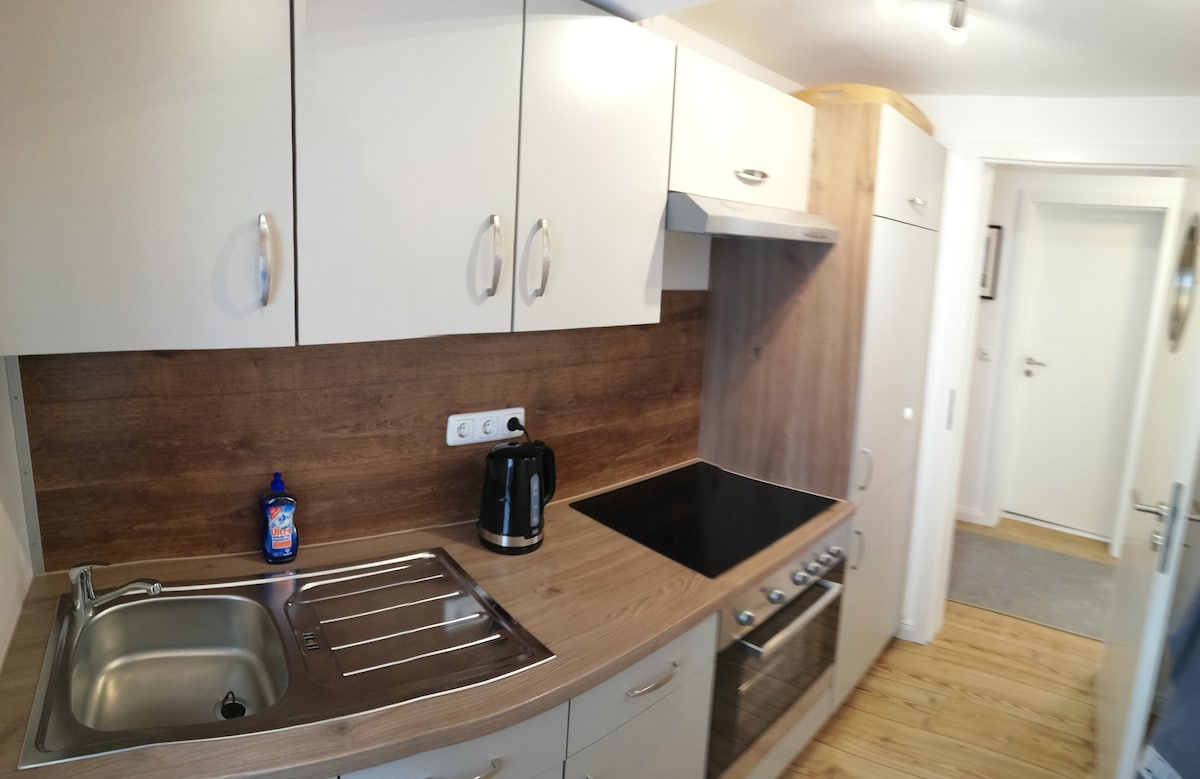 The 2-room apartment can accommodate ideally 2 adults and 2 children. If necessary, the 5th person can lie down on the cozy couch in the living room. Private small shower with toilet. There is everything you need for everyday needs in the apartment such as hairdryer, ironing board/iron, vacuum cleaner, TV, radio/CD player, coffee maker, kettle, toaster, fridge, microwave, washing machine, dishes and cutlery as well as a balcony and much more. No parties!