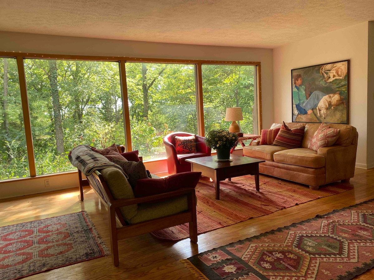 This beautiful mid-century house was designed and built by my father. My husband’s parents, Amy and Bob, bought it from my parents’ estate and renovated it. It is filled with light, books and original art. Being inside feels like being outside. It is furnished much as it was when my in-laws moved out, with many of Amy’s paintings. It is not a new or fancy house, but it is authentic and quite a splendid example of mid-century architecture! I hope that you love it as much as I love to share it!