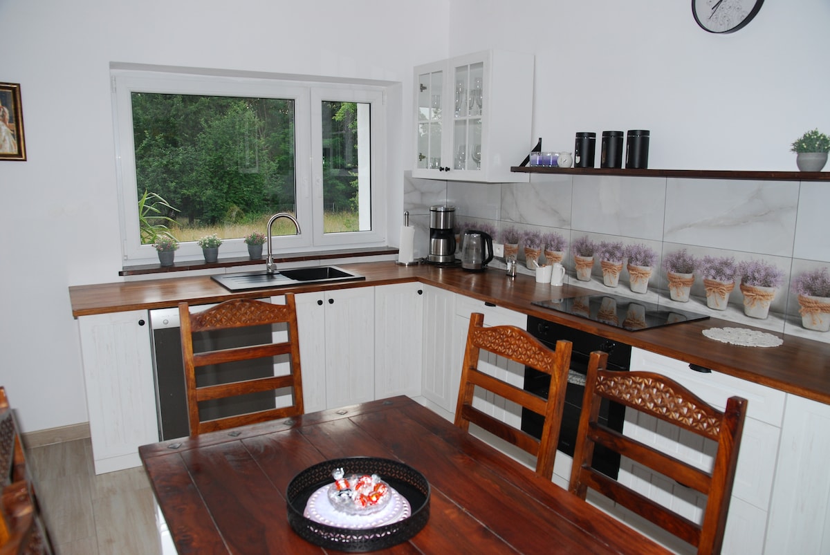 Forest, quiet, calm, stream, birds chirping, miles of undefined paths, priceless moments... and inside a heated pool, sun loungers, wood-burning fireplaces, and yoga mats. The nut cottage located in the heart of the Rzepinska Desert for 6-8 people, offers direct contact with the wildlife and comfort for relaxation and relaxation . The cottage has 3 bedrooms, a fully equipped kitchen, two bathrooms, a large living area and a recreational area with year-round indoor, warmed, pool.