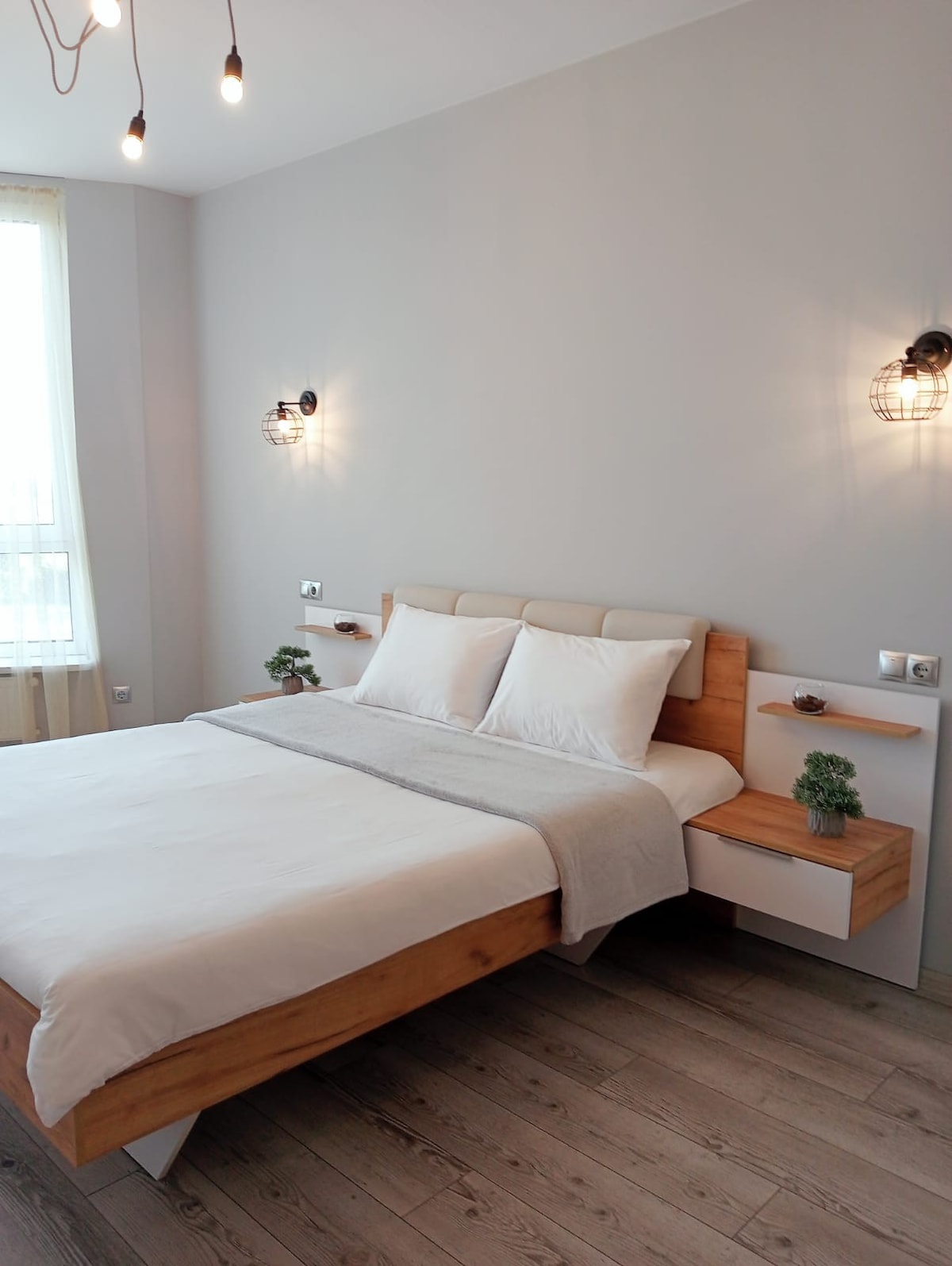 Нова простора, з високими стелями, більше 3м! квартира класу "люкс" реалізована у стилі арт-деко в поєднанні з класикою. Для комфортного перебування обладнана кондиціонером, теплими підлогами, індивідуальним опаленням, тощо. Є велике двоспальне ліжко у кімнаті і додаткове 2ох спальне місце - розкладна софа у кухні-вітальні. Необхідна побутова техніка: холодильник, плита, мікрохвильова піч, чайник, фен, а також професійна кавоварка. Wi-Fi. Постільна білизна, рушники, засоби гігієни. Безкошт кава