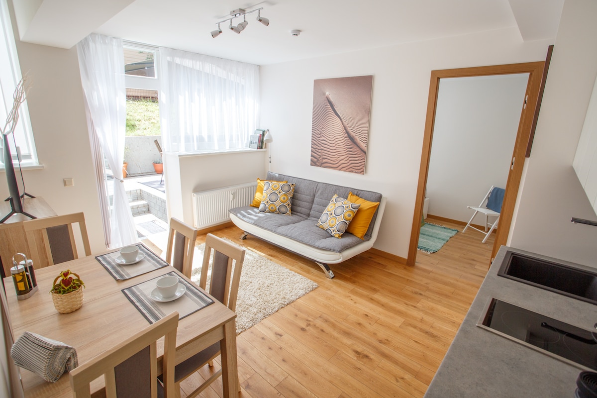 Brand new one-bedroom apartment in the heart of Palanga, Daukanto Street 8. Enjoy a spacious living room, fully equipped kitchen, and a outdoor terrace. Perfect for couples or families up to 4 people. Beach, main street, and cafes just a short walk away!