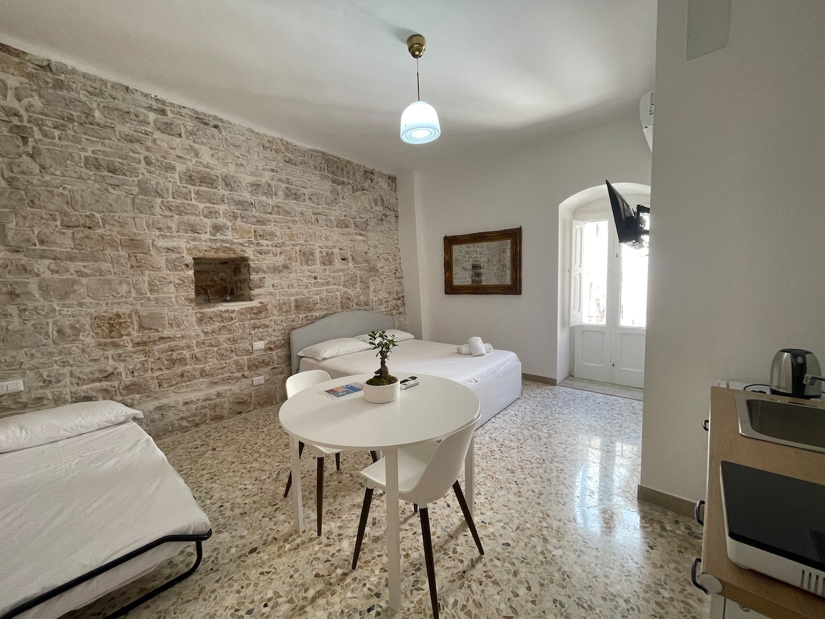 Located within the ancient Corte Forno Sant'Orsola, the stone studio, fully equipped, is just a stone's throw away from the sea and the public beach. Right in the heart of the historic centre, where the ancient communal bakehouse once stood, you immerse yourself in a unique experience, surrounded by stone, history, and the sea, getting lost in the narrow white streets and breathing in the typical air of Apulian historic centres. The area is vibrant yet peaceful, full of restaurants and bars.