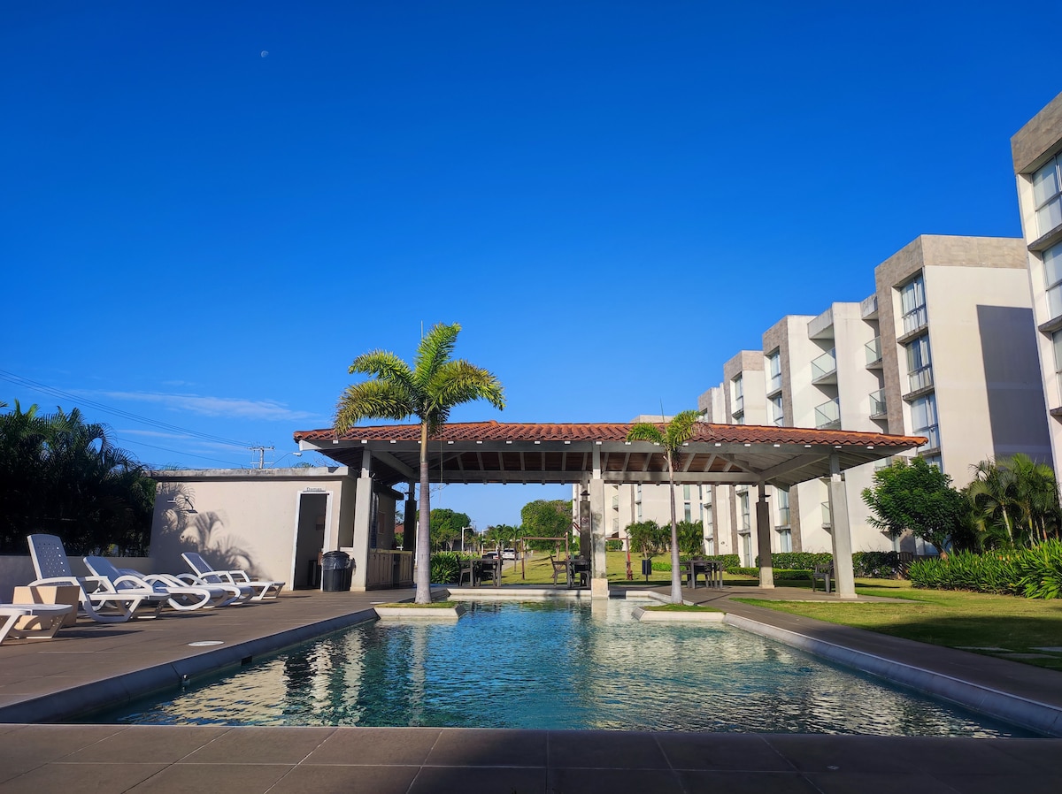 Relájate con la familia en este alojamiento donde la tranquilidad se respira. El edificion cuenta con 4 piscinas, 1 jacuzzi, 1 sauna, Gimansio, cancha de volleyball, futsala, Pickelball o mini Tenis, ranchitos, un restaurante y area de BBQ esta ultima se renta por $25 adicionales. El Apto cuenta con 2 habitaciones, sala, area de desayunador, linea blanca completa con lava platos, centro de lavado, 3 aires acondicionados, secador de cabello, plancha, balcon. 1 cama queen y un camarate.