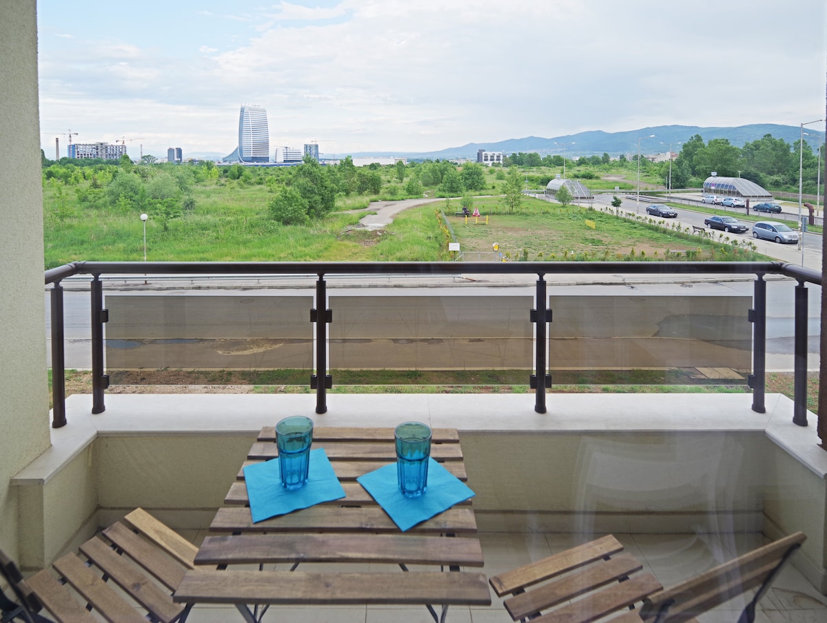 A brand new inviting apartment with a great view of Vitosha mountain. Furnished in a contemporary interior style, which makes it feels airy and spacious. Plenty of sunshine all year round! The apartment is located in a private complex, on the 10th floor. A cozy and comfortable place! Just 8min walk from Inter Expo Subway Station and 10min away from the city center by car. It is also convenient to get to the airport, both by subway and taxi.