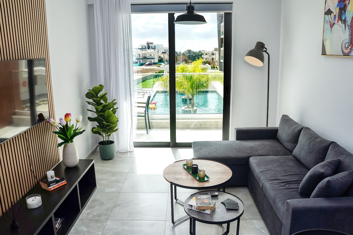 Aqua Blue is a gorgeous apartment in a beautiful complex of Kissonerga, Paphos. Indulge in the peaceful surrounding area with its pool views right at your doorstep, beautiful lush gardens and all the advantages of a modern Mediterranean design. It is located 12 minutes walking distance to the one of the nicest beaches of Paphos - Sandy Beach, only few minutes walking distance to the picturesque local square with all the tavernas and amenities and 10 mins by car to downtown Paphos.