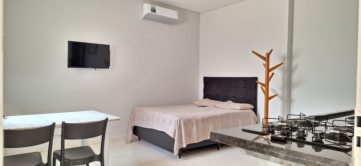 Apartamento amplo de um quarto, um banheiro e sala. Acomoda dois em cama de casal, mas tem um colchão avulso que pode ser utilizado. A geladeira pode ser usada. Ótima localização com mercado, padaria e sacolão perto. Menos de 5 minutos do centro.