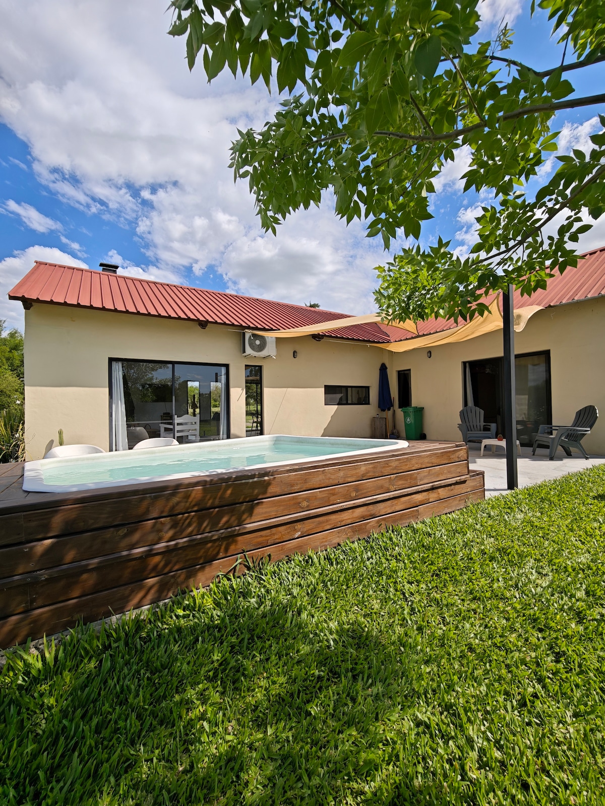 The place is less than an 8-minute drive from Grape Festival Park. It has an open concept with 3 floors, 1st floor: swimming pool with a small room, 2nd floor: living room, kitchen, bathroom, 3rd floor: mezzanine with two mattresses and bathroom. The decor is rustic and simple, but cozy with great outdoor spaces. The deck overlooks a stream that cuts through the terrain, providing a relaxing sound. The pool is heated only from October to March.