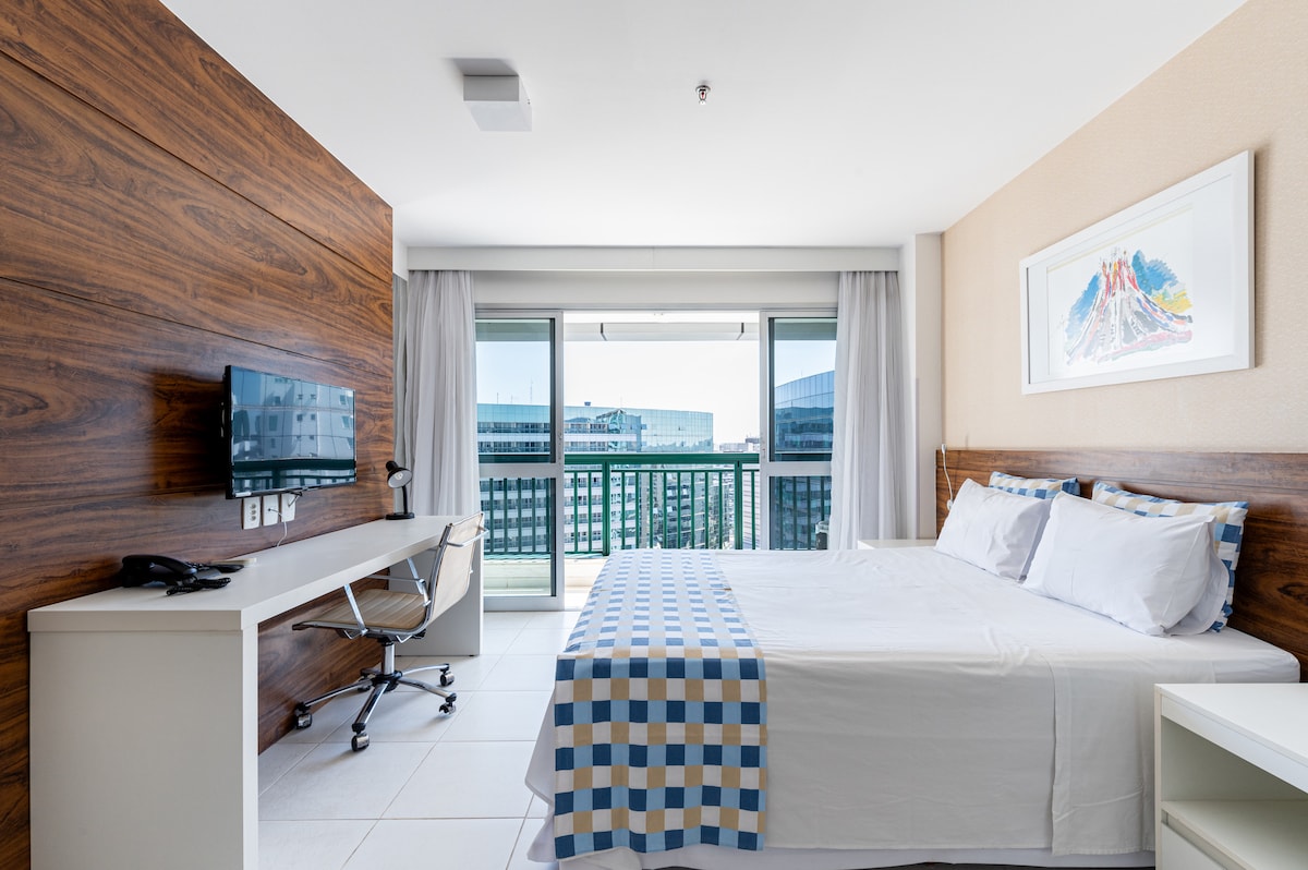 Flat at Hotel Garvey (currently undergoing renovation on the external façade) located in a prime area of Brasília. Functional and comfortable environment, providing the guest with exquisite conditions for rest or work, with exquisite finish, newly renovated to a high standard. In addition to all equipped with new utensils of canopy, kitchen, bed and bath linens (daily change), Smart TV 50' 4K. And swimming pool! The hotel reception is open 24 hours a day, with the possibility of renting a private garage.