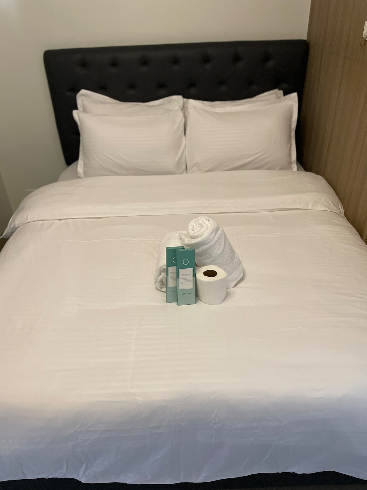 Wake up with the tropical palms as ur view from ur bed thru glass door. It has Queen bed & hotel quality ortho mattress, pillows and linen for luxury sleeping experience. Equipped with your basic kitchenette needs. 800m from Mall of Asia, 20 mins from airport, Theatres, Esplanade, With alfamart, Starbucks & restaurants at the ground. Pool is accessible for a fee. Jump off straight from your balcony to the pool after pre registration and easily access back your unit by dedicated step.