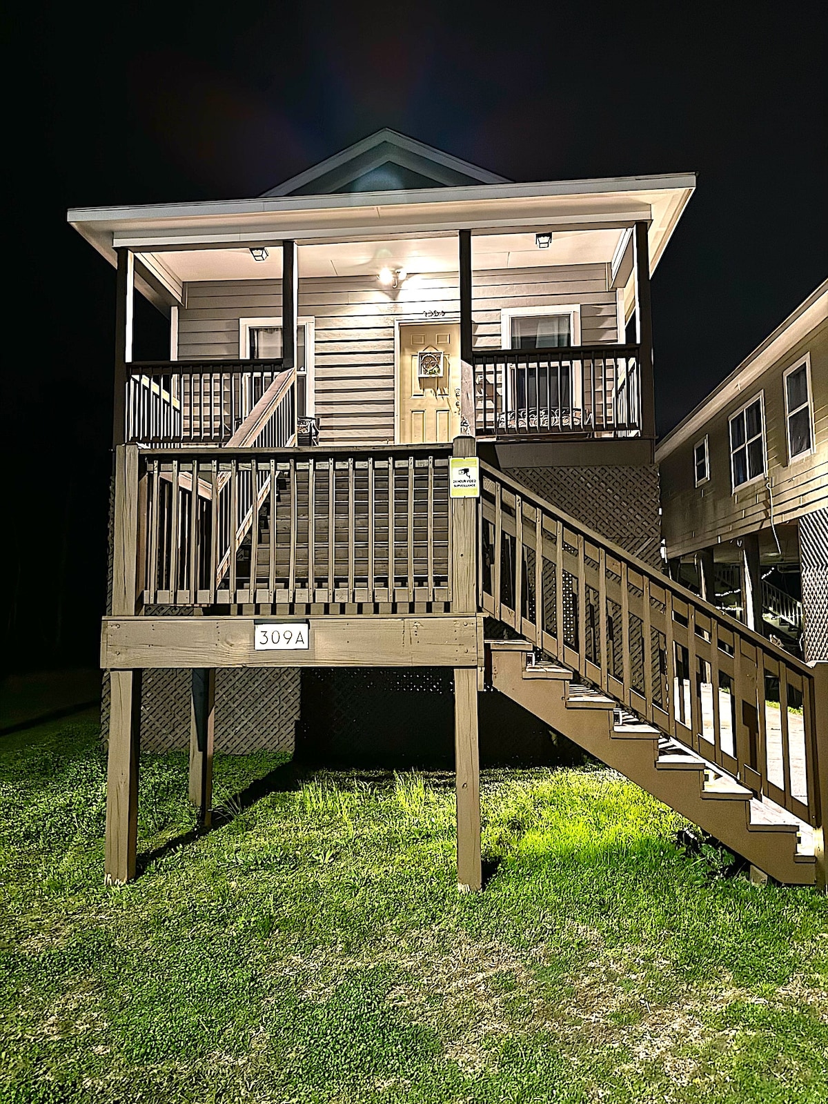 This home is located on 0.6 acres on a quiet, dead end street. It is raised on stilts, allowing a nice parking/gathering area under the home (and a half bath), and two floors of living space up above. The property backs up to a canal, where you can fish from the shore or watch up above from the back deck. The front deck has it's own peaceful treelined view. Located about 1 mile from the beach and 3 miles from local restaurants.