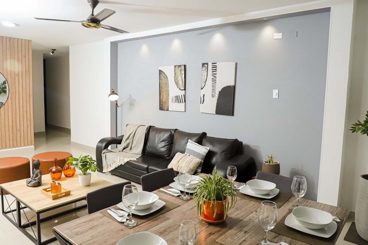 Excellent location, an ideal space to enjoy, a good atmosphere, air conditioning, we have spectacular decor, you will feel at home. It has all the basic utensils, elegant and sober, excellent view from the balcony directly to the mountains, a quiet and safe space, we have 24-hour surveillance, doorman and parking service