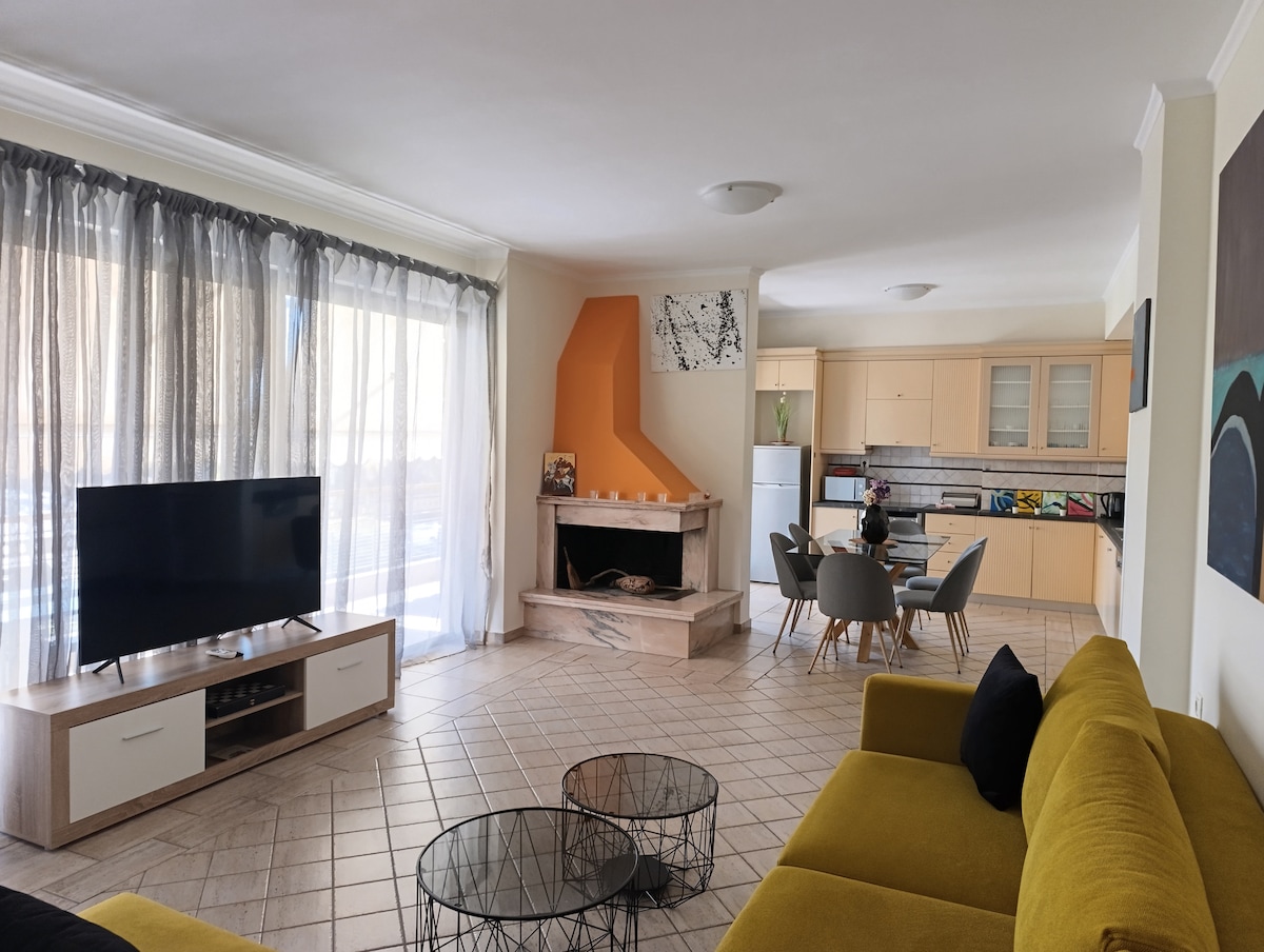 A cozy retreat blending rustic stone walls with modern comforts, this Airbnb is just 10 minutes from the city center and the beach, and only 5 minutes by car from the archaeological museum—yet it remains exceptionally quiet. It is also just a 10-minute walk from public transport.Enjoy panoramic terrace views of the glittering sea, vibrant cityscape, and the iconic Rio-Antirrio bridge. Inside, you'll find a welcoming fireplace and a peaceful atmosphere—perfect for relaxing after a day in town."