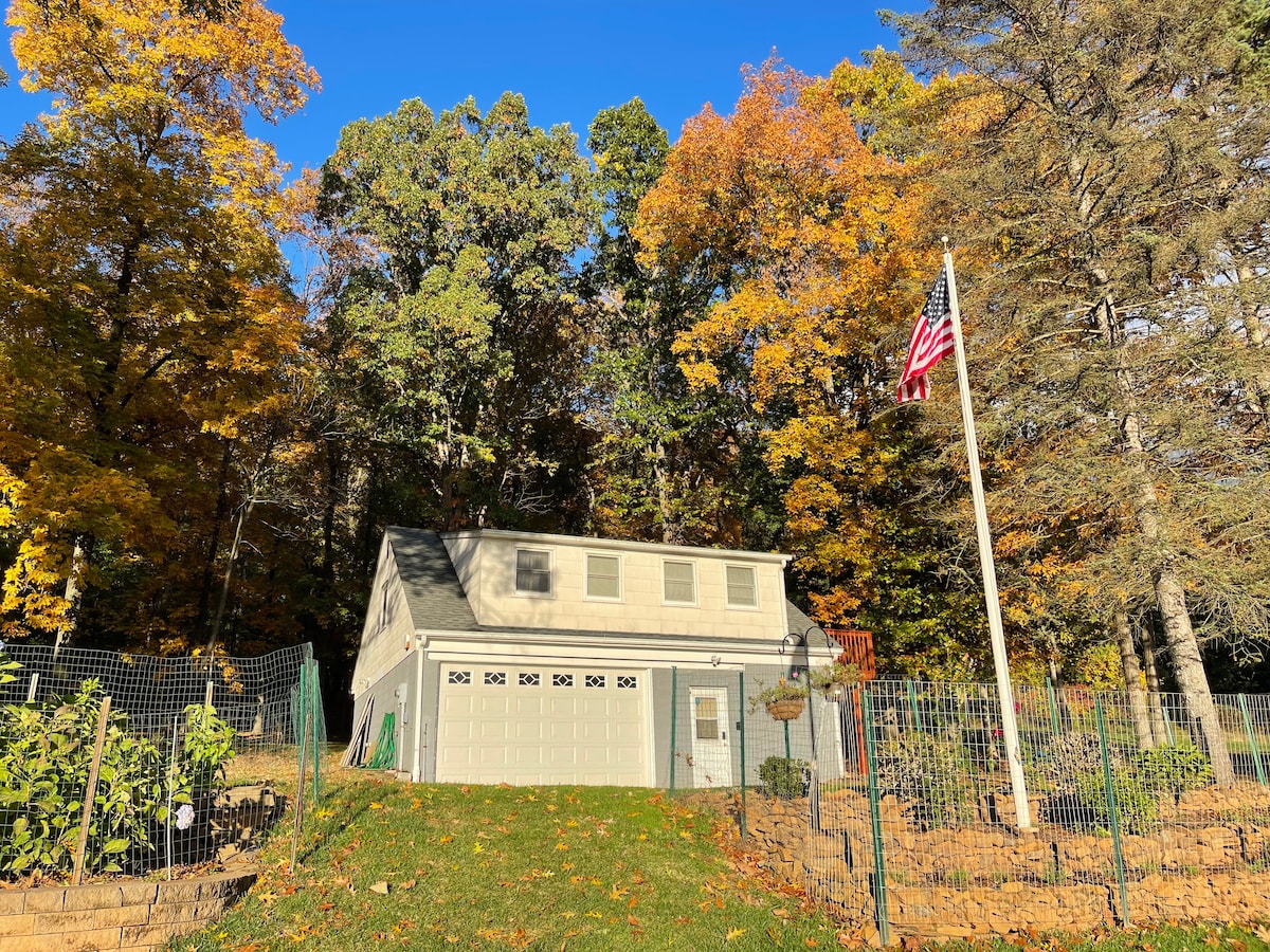 A quiet, safe countryside lifestyle 1 hour from Manhattan, NJ beaches, or the Delaware Water Gap. Walk, Bike, fish watch birds and see historical sites where George Washington marched. Senior couple's 2 acre lot among huge trees. The rustic outside of the unit gives way to a comfortable living space on the top floor and the bottom floor is a wide open utility room with a second bath, electric stove, full laundry and a place to store things while in transit or if moving in or out of the area.