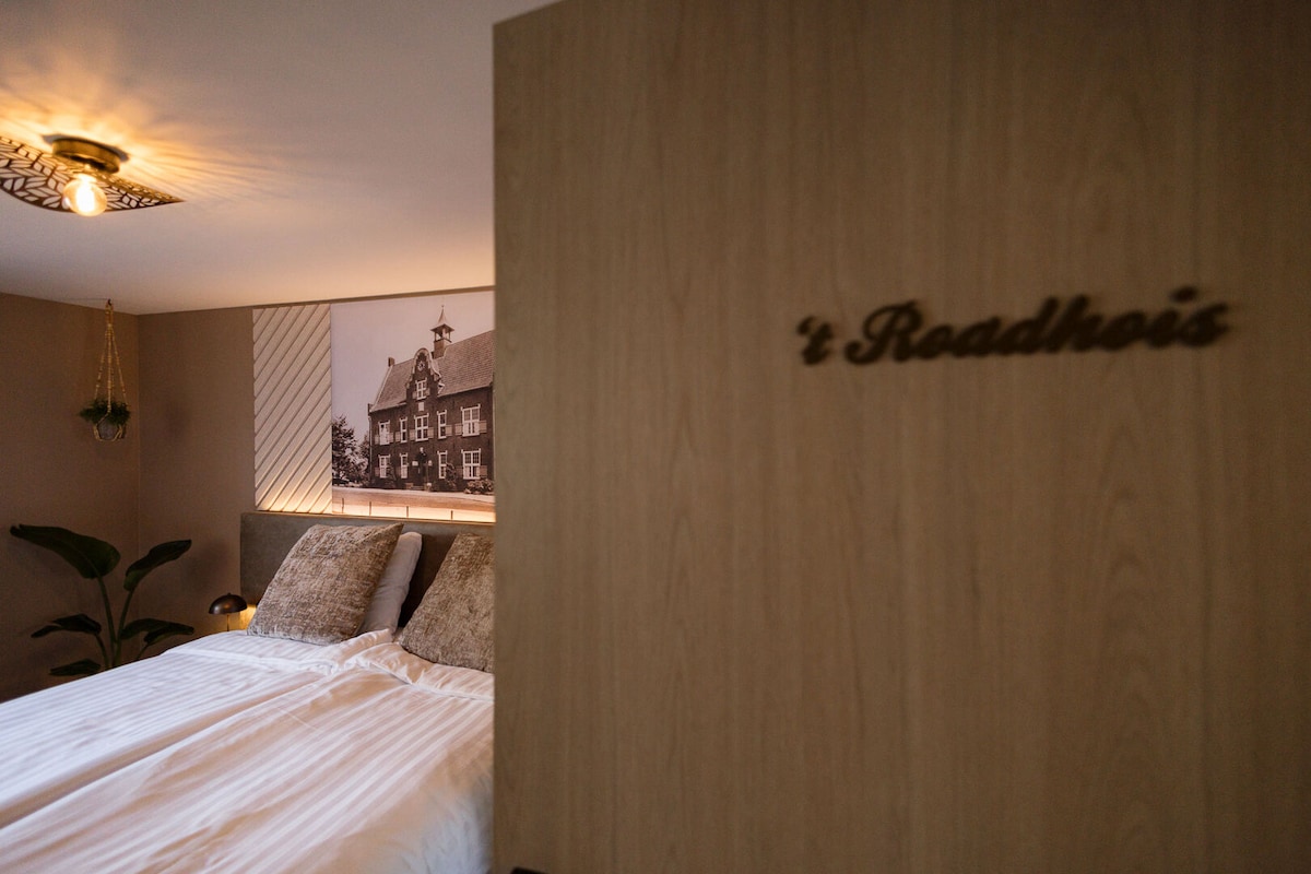 The atmospheric room ’t Roadhois combines a warm, modern design with a nod to the history of Someren. Enjoy a comfortable king-size bed, a modern bathroom, and all the amenities you need. A perfect place to relax after a day in the heart of Someren. Room size: approx. 24 m² Facilities: King-size box spring bed with luxury bedding Flat-screen TV Desk with chair Wardrobe/open shelving unit with mirror Coffee and tea facilities Mod