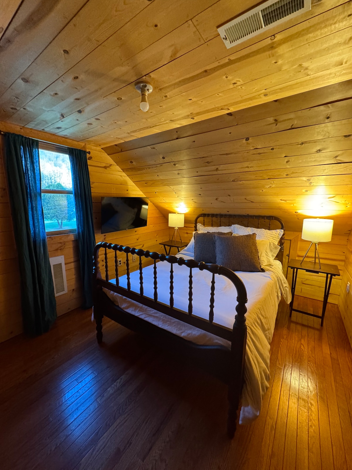Cabin in the Shenandoah Mountain surrounded by National Forest on 3 sides. Inside cozy atmosphere with warm lighting and local landscape art throughout. Bright and cheery in the bedrooms best suited for 2-4 adults or family with children. Wonderful sound of the river throughout the property. Step outside to hundreds of miles of biking and hiking trails, and stocked lakes and streams. Well maintained paved state road to cabin driveway. The house is 20 minutes West of Harrisonburg VA and JMU.