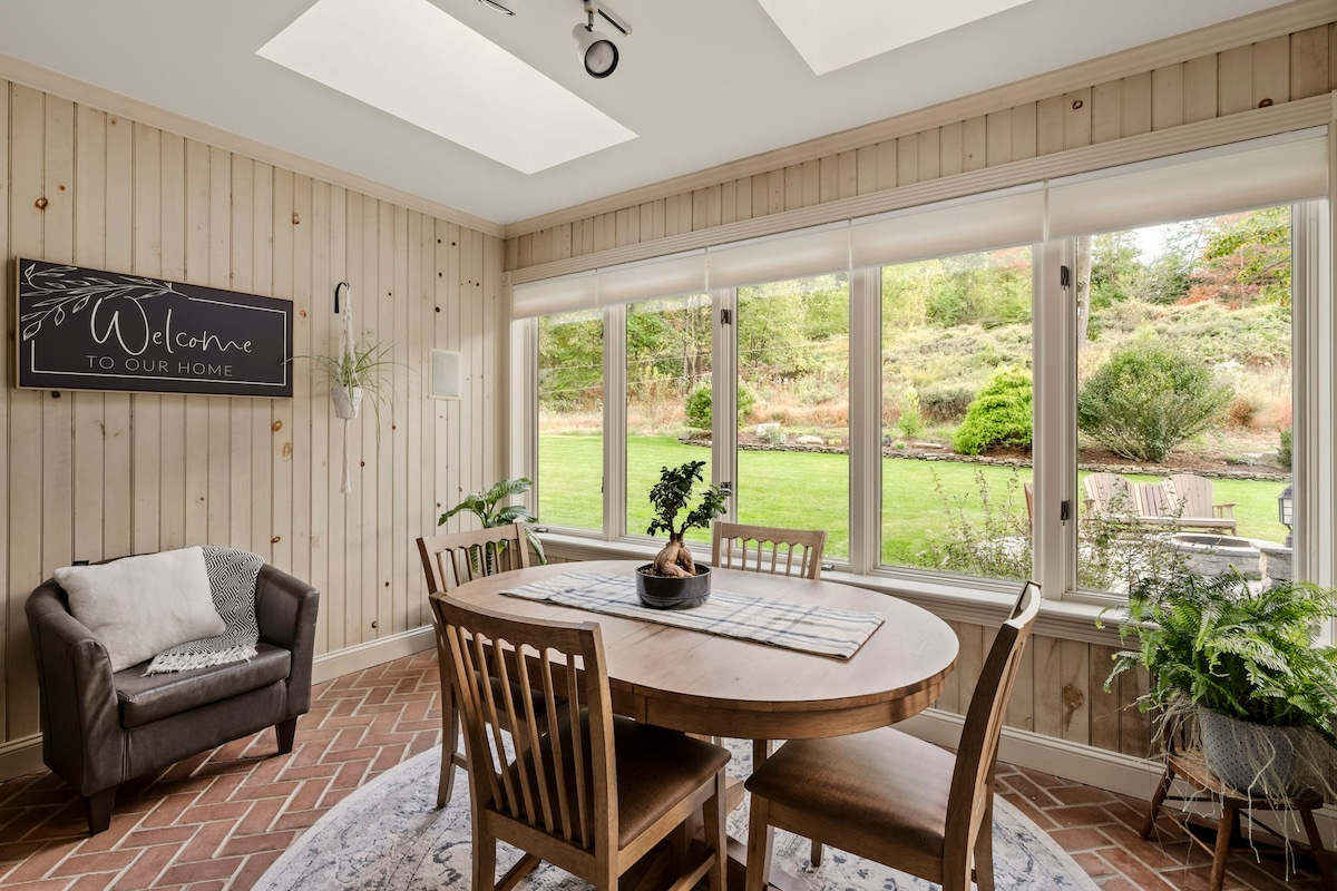 Newly renovated 4BR/3BA chalet on 10 private wooded acres in the Pocono Mountains. Sleeps up to 12 guests and is packed with amenities: a sauna, indoor fireplace, outdoor fire pit, two dedicated workstations with fast Wi-Fi, a yoga space, sunroom, and a fully stocked kitchen. Whether you’re seeking adventure or relaxation, you'll have quick access to the Pocono Mountains top attractions—whitewater rafting on the Lehigh River and skiing at Blue Mountain, Camelback, Jack Frost, or Bear Creek.