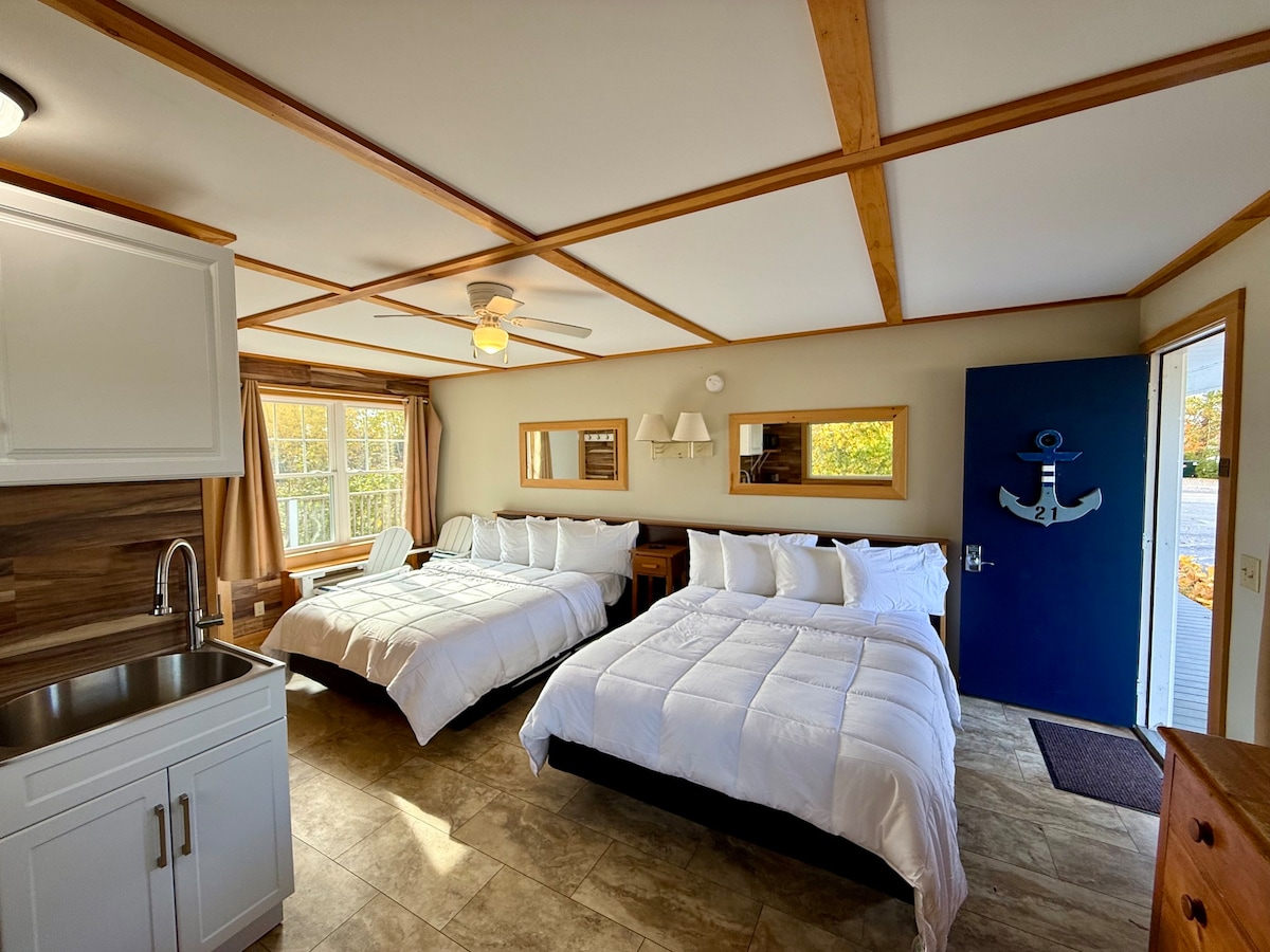Mansell Port is a cozy, small harbor view studio efficiency on the 2nd floor that has 1 queen bed, kitchenette, pull-out sofa, private bathroom, TV, wifi, private balcony, and a gas fireplace. Contactless check in's available, see Check in Instructions. Located on the 2nd floor. A/C provided All rates based on double occupancy. Beach access available all year!