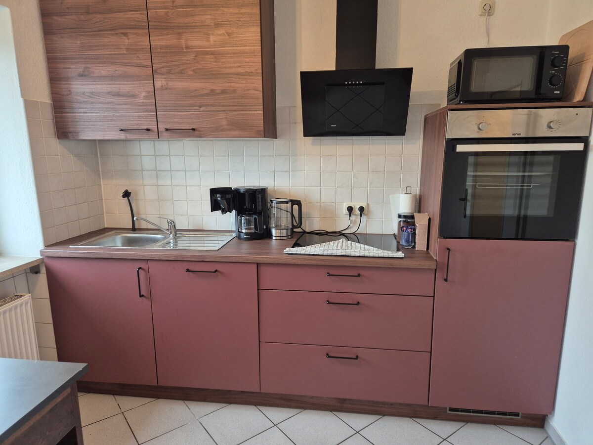 Die Wohnung befindet sich in einem 300 Jahre alten Fachwerkhaus. Sie ist sehr geräumig und trotz Zentrumsnähe absolut ruhig. Die Sanierung erfolgte unter ökologischen Gesichtspunkten. Durch die alten Lehmwände herrscht ein natürliches Raumklima, sie bedürfen allerdings besonderer Lüftungsregeln, an die sich der Mieter halten muss. Es darf von Oktober bis April nur nach dem Stosslüftungsprinzip gelüftete werden (ca. 10 min Querlüften morgens und abends). Einen Fernseher gibt es nicht.