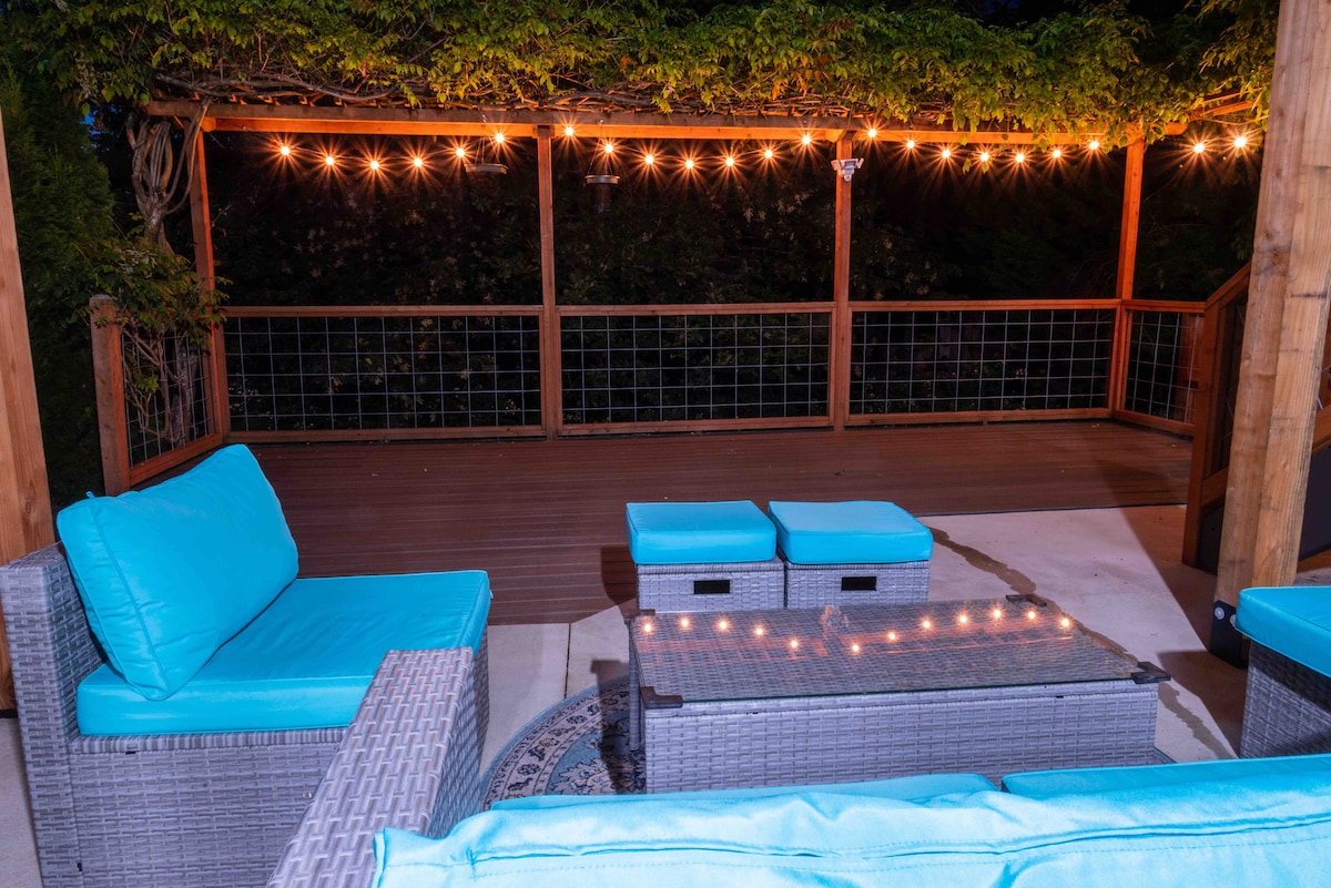 Stay warm by the fire, whether on the built-in seating around the fire pit, or inside, on the sectional sofa by the linear gas fireplace below the Samsung frame TV. Also inside are floor-to-ceiling windows, radiant floor heating, and exposed-beam accents. The apartment features a stunning open plan living space with a well-equipped kitchen in addition to two bathrooms featuring a luxurious walk-in rain shower!