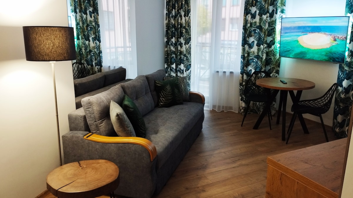 A two-room apartment of 56 sq meters with a balcony on the first floor. Separate entrance. Bedroom with TV, two single beds that can be put together. Large room with TV, double bed. Living room: corner bed + single bed (in the chest of drawers) + two single beds with the possibility of combination. Both rooms are air-conditioned. The kitchen is fully equipped with a dishwasher. In the bathroom, there is a washing machine and an iron. Wi-Fi in the apartment. Free parking.