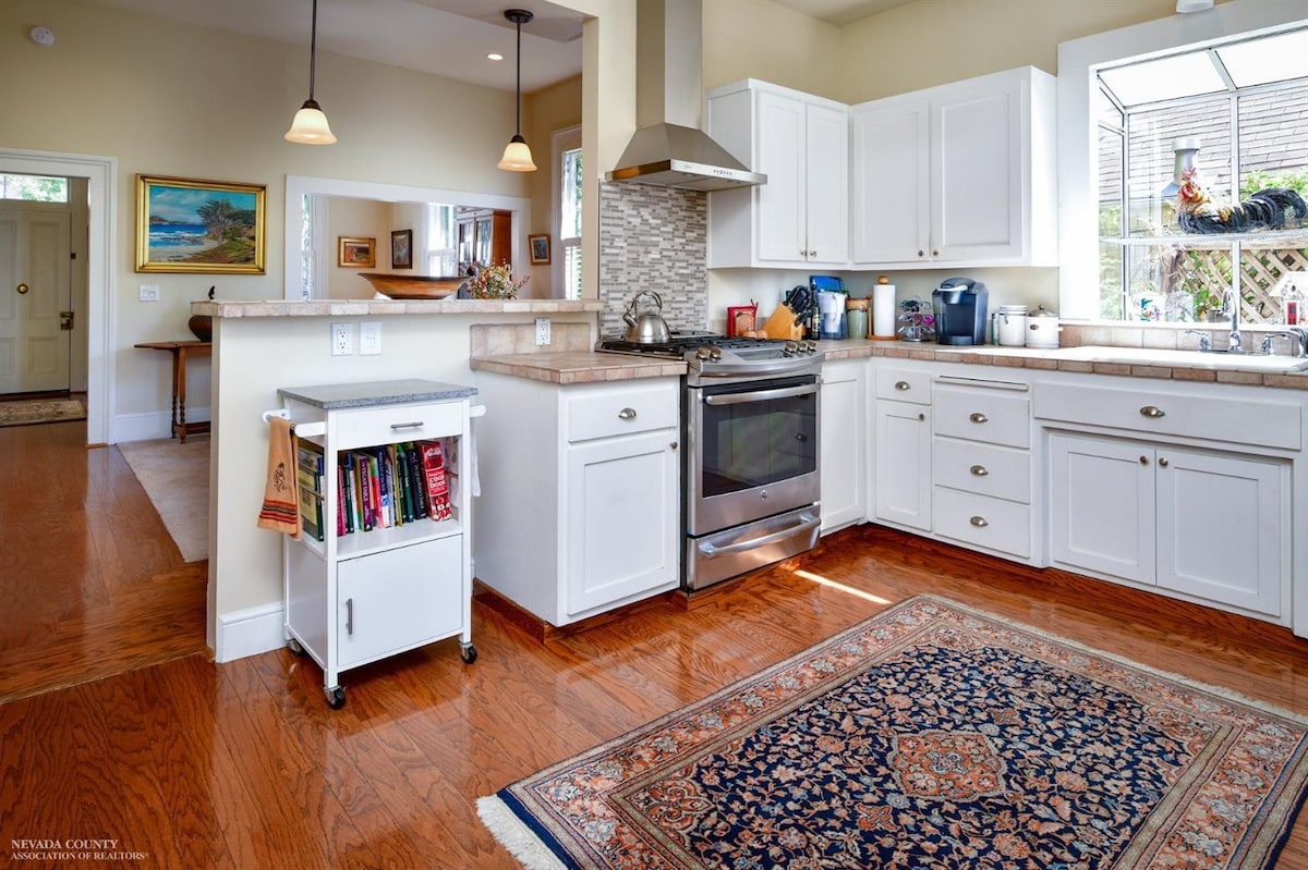 Warm and Cozy with new Heating and Air conditioner! Fully renovated true one bedroom, one story, No Stairs, guesthouse with a full size kitchen, newly remodeled bath with a walk in shower, extremely comfortable queen size bed in one of the nicest neighborhoods in Nevada City. A spectacular view from your private deck, located 2 miles from downtown Nevada City and a mile from restaurants and shopping. At 3,000 feet, you feel cool mountain evenings and yet very close to all the amenities!