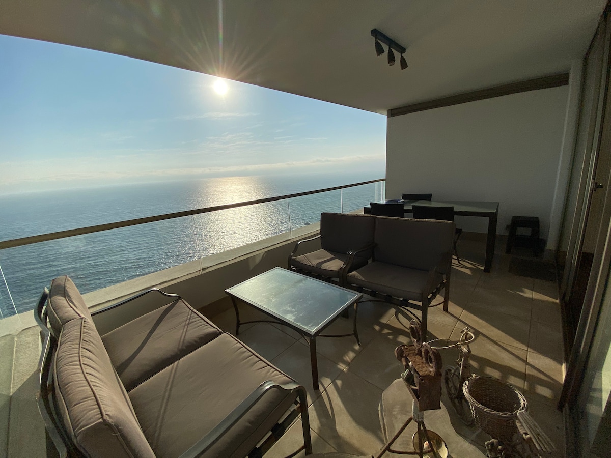 Lindo departamento con terraza vista al mar, un dormitorio un baño, completamente amoblado y equipado. Cuenta con wifi y cable para la tv smart de 42 pulgadas. Excelente iluminación. Edificio cuenta con consejería 24 hrs, 2 piscinas: exterior y temperada, gimnasio, sauna, quincho, lavandería y estacionamiento. Se encuentra cerca de supermercados, bencineras, farmacias. Ubicado a 5 minutos de la playa en auto, y 20 minutos a pie. Se ofrece descuento del 10% a estadías mayores a 7 días.
