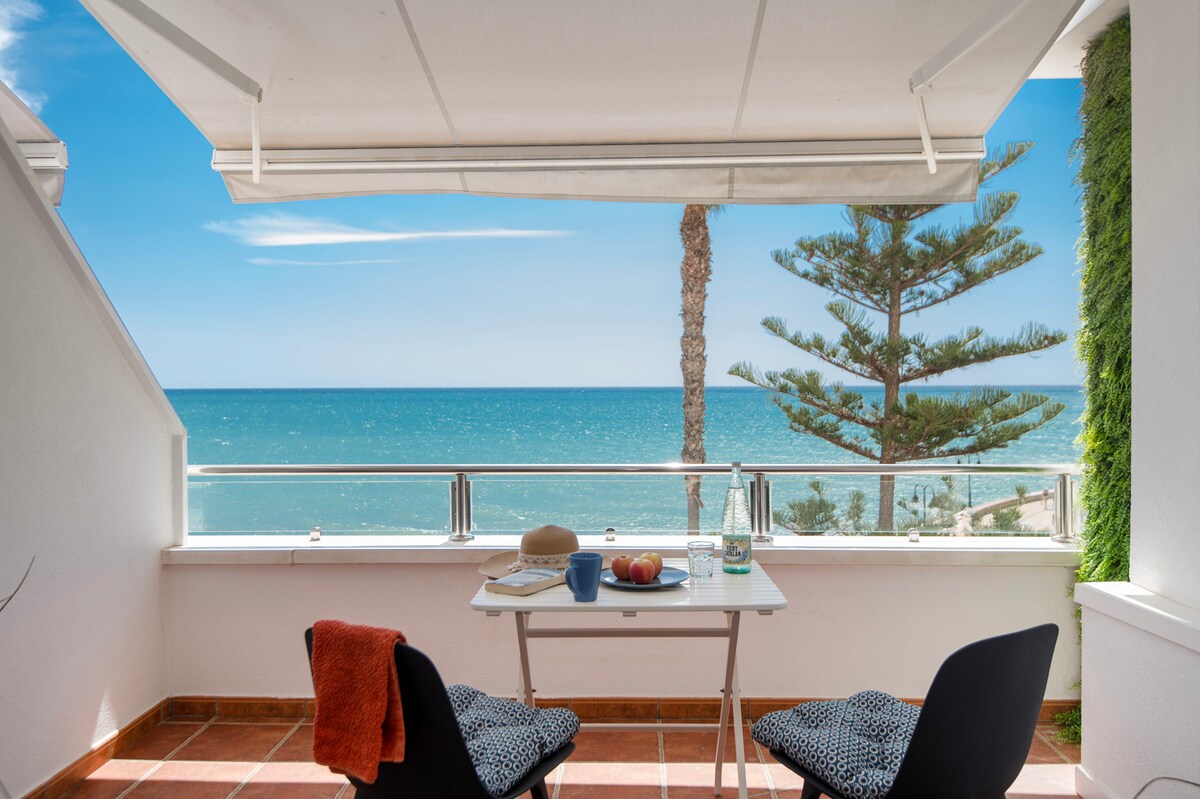 Lujoso apartamento en primera linea de playa con vistas al mar. Disfruta de un relajante baño en su bañera hidromasaje transparente con cromoterapia y cascada, con unas inmejorables vistas al Mediterráneo. Degusta una copa de vino en su hamaca colgante mientras ves el atardecer.