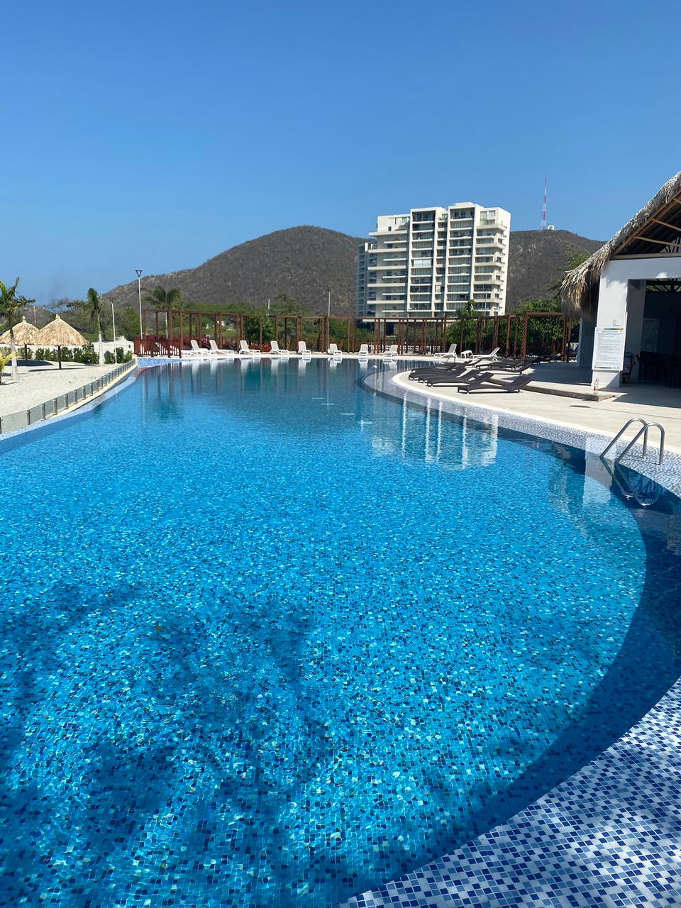 Enjoy a luxury apartment in the preferred area of Rodadero just 15 minutes from Simón Bolívar International Airport and a 10-minute walk from Rodadero. It has a private exit to the beach, a beach club, green areas with ecological trails, a panoramic terrace with wet areas (Jacuzzis, bars, several swimming pools for adults and children) among other amenities such as a micro-soccer field, gym, ping-pong, among others of Resort style for your enjoyment.