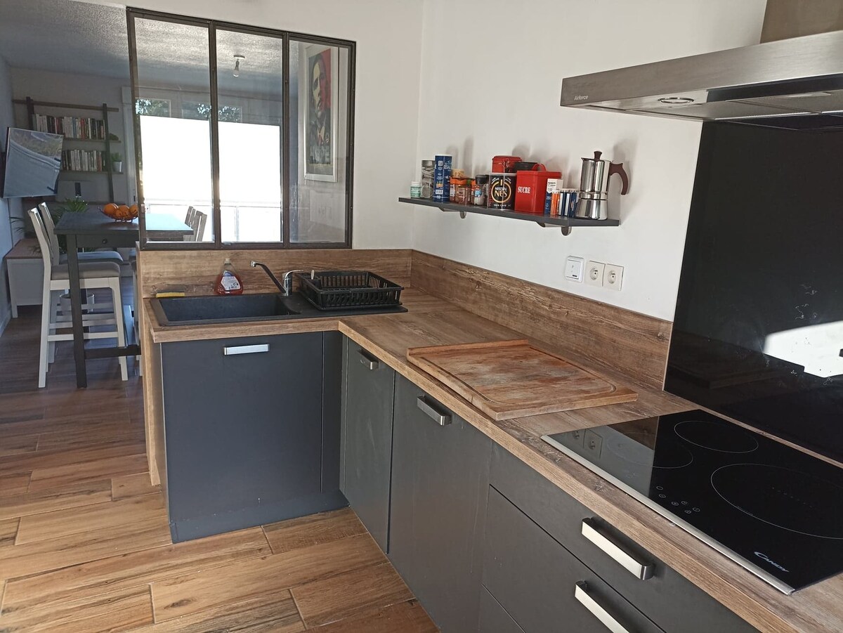 New apartment in luxury residence. The entrance equipped with a cupboard serves a living room with equipped kitchen (4-burner ceramic hob, dishwasher, 140 l refrigerator, microwave and grill, coffee maker, kettle, dishes...) Separate bedroom with mattress topper, separate toilet, bathroom with two sinks and towel dryer. Free and secure parking. The residence has 22 charging stations for electric vehicles from 22 kW to 250 kW.