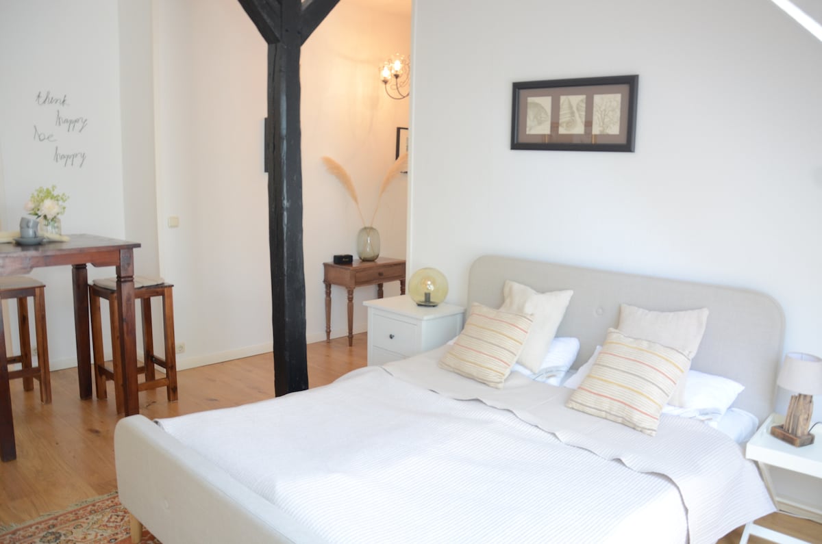 Cozy, beautiful, bright attic apartment, 2 single beds 1.00 x 2.00 m or pushed together as a double bed (200 x 200), as well as a single bed (100 x 200) in the separate adjoining room (also dressing room). If more guests are added, it is possible to fold out a folding mattress for the floor; small fully equipped pantry kitchen, great bathtub and shower, TV, telephone and Wi-Fi Private parking is available right outside the front door.