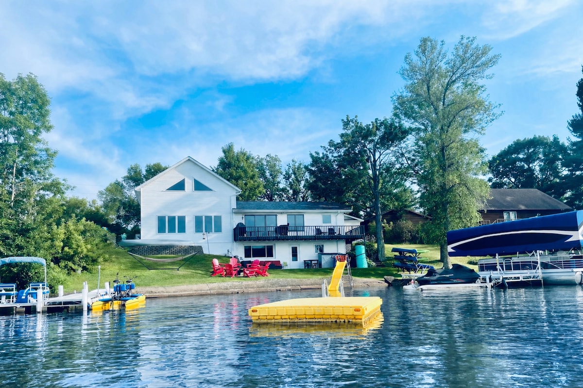 Your private family lake escape! Fully updated, tranquil and relaxing, yet modern. Relax and enjoy the lake from the deck or picnic areas. Cast a line from the dock or hop in the provided kayaks or mini pontoon! Enjoy a warm bath in the new jacuzzi tub & breathtaking double-shower, then cozy up to a movie in front of the electric fireplaces! BBQ grill & flat top included. Large loft w/ 2 queen beds & master bedroom w/ king. Perfect for priceless family memories on the lake. Fiber internet, too!